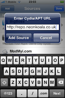 Step 1: Jailbreak your iPhone 2G/3G using the steps given above. When you’re done, run Cydia from your iPhone’s springboard, and add “http://repo.neonkoala.co.uk/” (without quotes) as repository. Tap “Add Source”, and then you need to install “Bootlace” as shown in the screenshots below.
